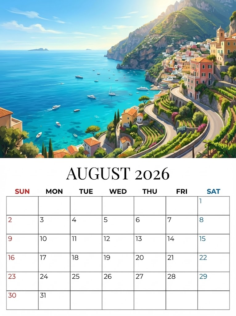 A vertical wall calendar page, 3:4 aspect ratio, full-bleed design. Top half: A breathtaking, wide-angle landscape digital painting of the Amalfi Coast in Italy during a sunny summer afternoon, vibrant turquoise Mediterranean sea and colorful cliffside houses, semi-realistic style with rich colors. Bottom half: A clean monthly calendar grid on a solid white background, divided by thin (0.5pt) black lines. Typography & Layout: