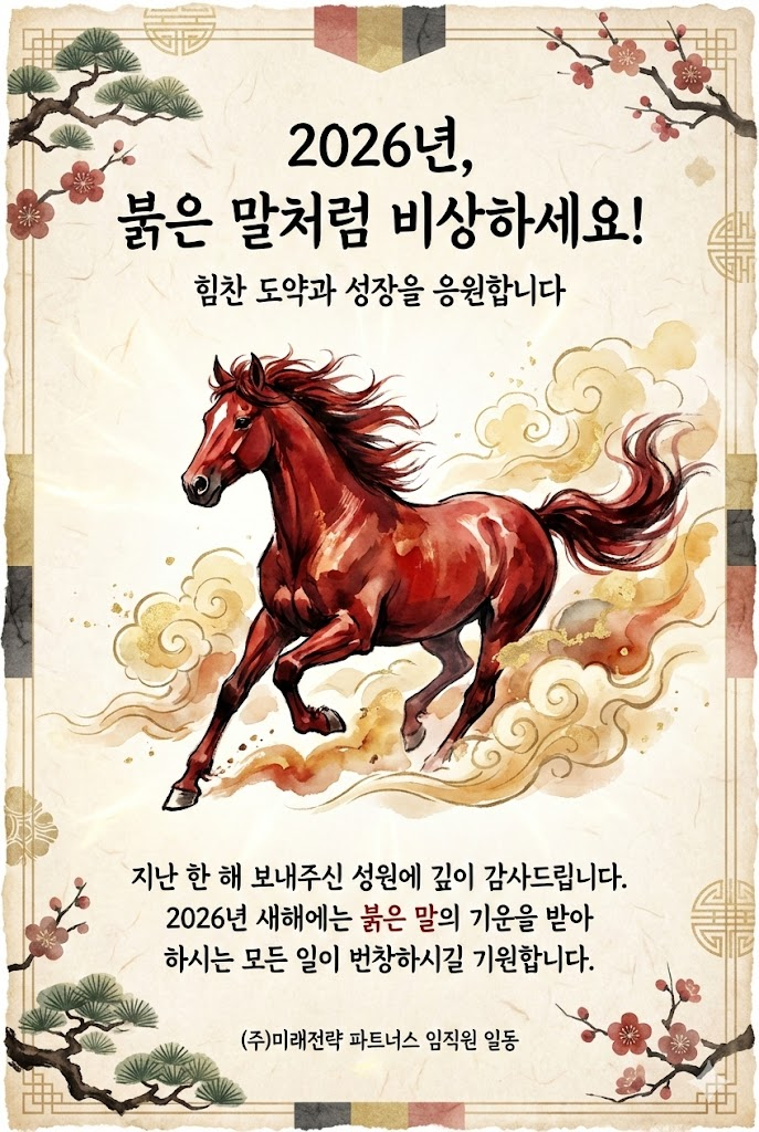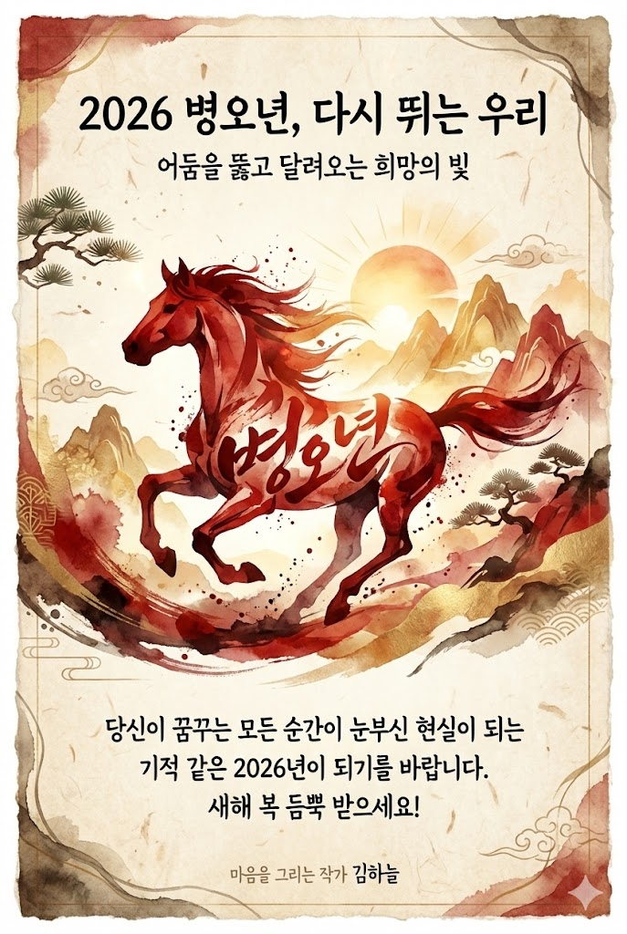 - 2026년 상징성 극대화: 붉은 말(병오년)을 테마로 설정하여 한 해의 의미를 강조하고, 한국적인 수묵화와 수채화 기법을 조화시켜 고급스러움을 더했습니다.
