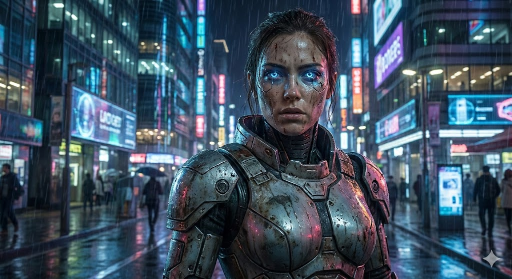[A female cyborg warrior standing in a neon-lit futuristic city street, wearing worn-out metallic armor, glowing blue eyes, rain falling on her face, intense expression]