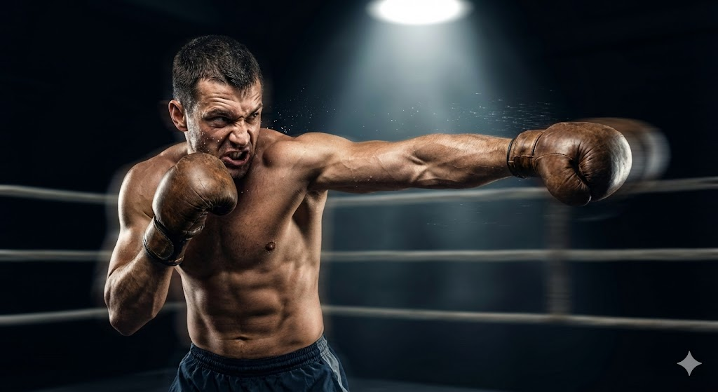 [A muscular martial artist throwing a powerful punch, sweat dripping from his face, dynamic motion blur, dramatic spotlight in a dark boxing ring, intense angry expression]