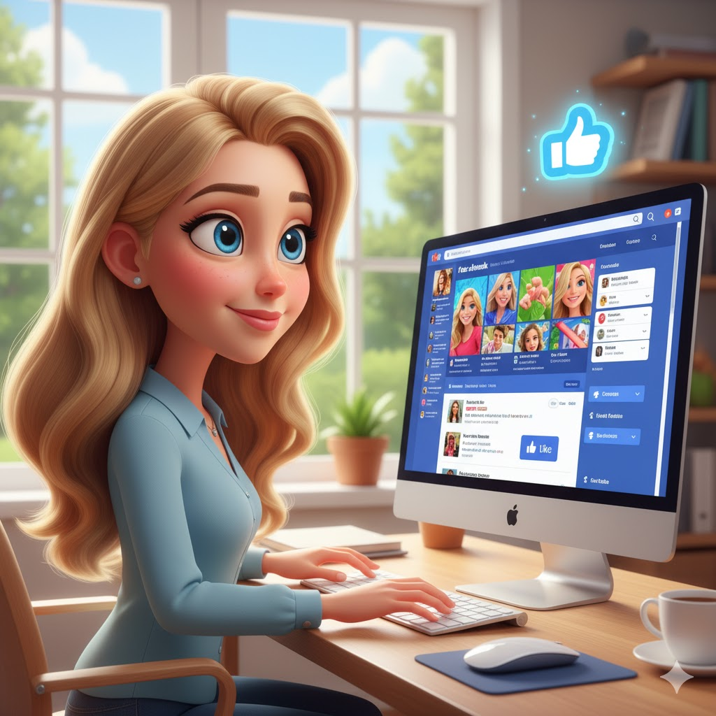 {"style": "3D cartoon illustration", "scene": {"environment": "Bright, modern home office setting with a large window in the background, showing a sunny outdoor view. Desk with a plant and a coffee cup.", "main_subject": {"type": "cartoon_character", "appearance": {"gender": "female", "features": {"hair": "long, wavy blonde hair", "eyes": "large, expressive blue eyes", "expression": "focused and pleasantly engaged"}, "clothing": {"outfit": "casual, stylish top (e.g., light blue blouse)", "accessories": "subtle necklace"}}, "action": "sitting at a desk, looking at a large monitor displaying a vibrant Facebook feed, interacting with a mouse and keyboard, smiling slightly."}, "objects": [{"type": "computer_monitor", "description": "large, flat-screen monitor showing a colorful and active Facebook interface with profile pictures, posts, and like buttons."}, {"type": "mouse_and_keyboard", "description": "modern, sleek computer mouse and keyboard"}, {"type": "facebook_like_icon", "description": "a subtle 'Like' icon floating near the monitor, indicating interaction."}]}, "mood": "connected, engaged, productive, positive", "details": {"lighting": "bright, natural daylight from the window, soft desk lamp glow", "textures": "smooth 3D surfaces, vibrant screen display, subtle texture on clothing and desk."}}