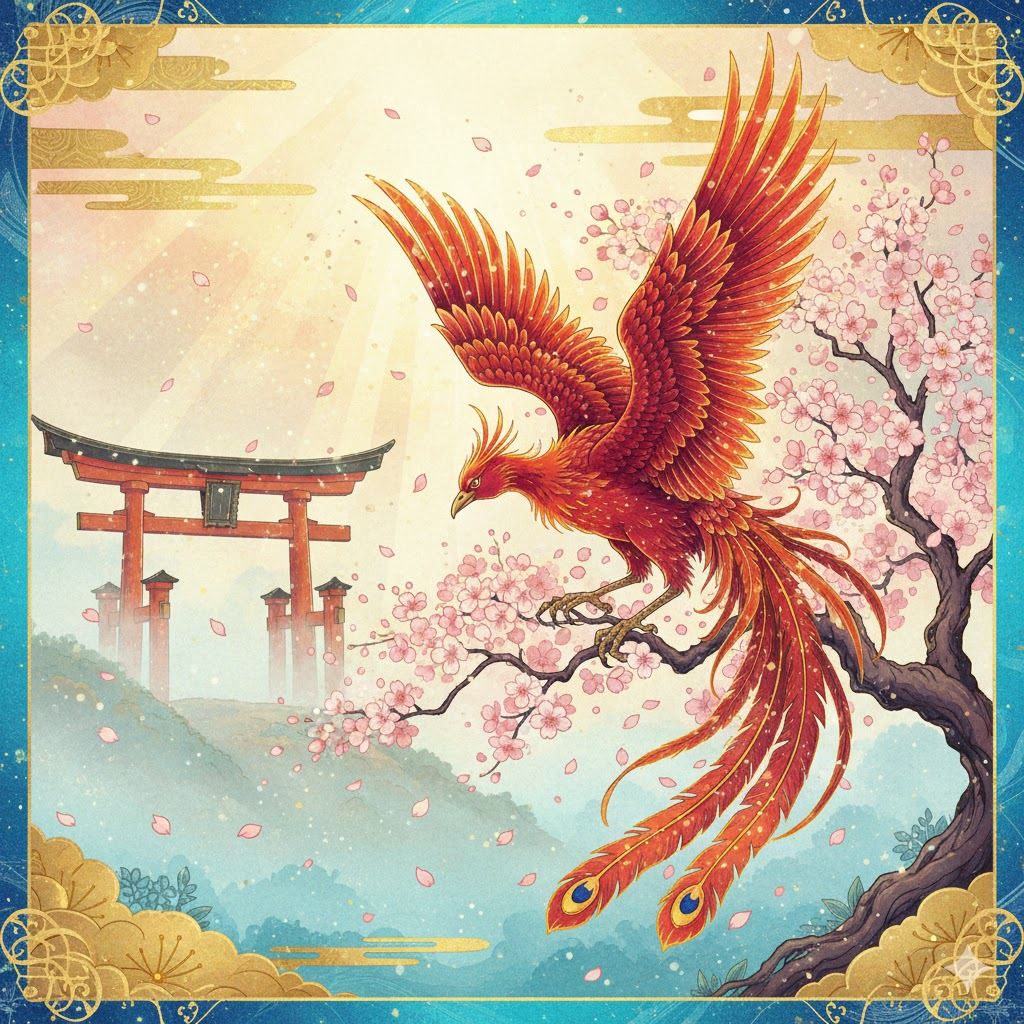 An illustration in Japanese ukiyo-e style: [A majestic phoenix with shimmering scarlet and crimson feathers descends gently upon a blossoming cherry tree, where petal showers drift down gracefully.] [In the background, an ancient shrine gate (torii) stands at the edge of a hillside under a soft spring morning sky, with rays of light breaking through the mist]. Delicate golden clouds, traditional Japanese patterns, vibrant blues, turquoise, and gold are enhanced with cosmic sparkle.