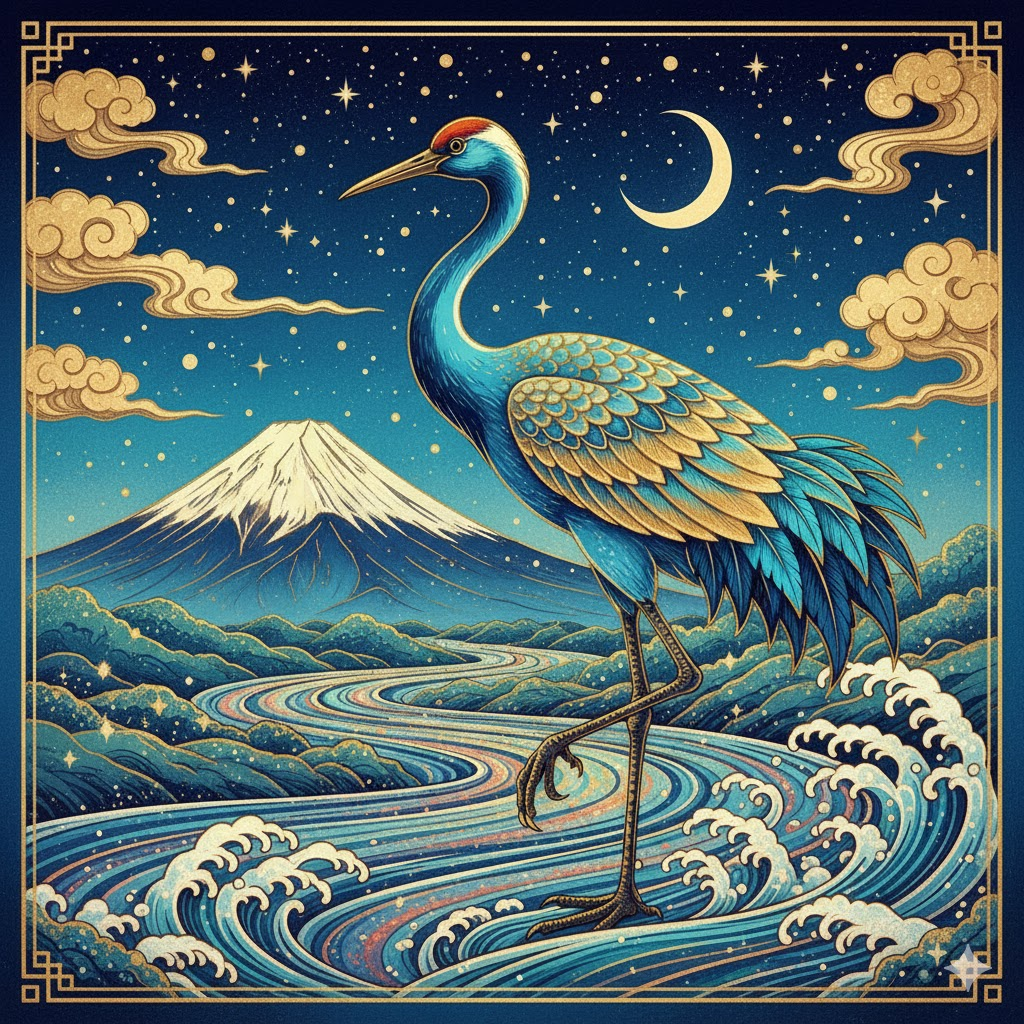 An illustration in Japanese ukiyo-e style: [An elegant great crane with brilliant azure-blue and golden feathers stands by a river where sparkling, multicolored waves flow.] [In the background, Mount Fuji stands tall beneath a starry night sky, accompanied by a crescent moon]. Delicate golden clouds, traditional Japanese patterns, vibrant blues, turquoise, and gold are enhanced with cosmic sparkle. It boasts an extremely intricate and rich texture with complex details.