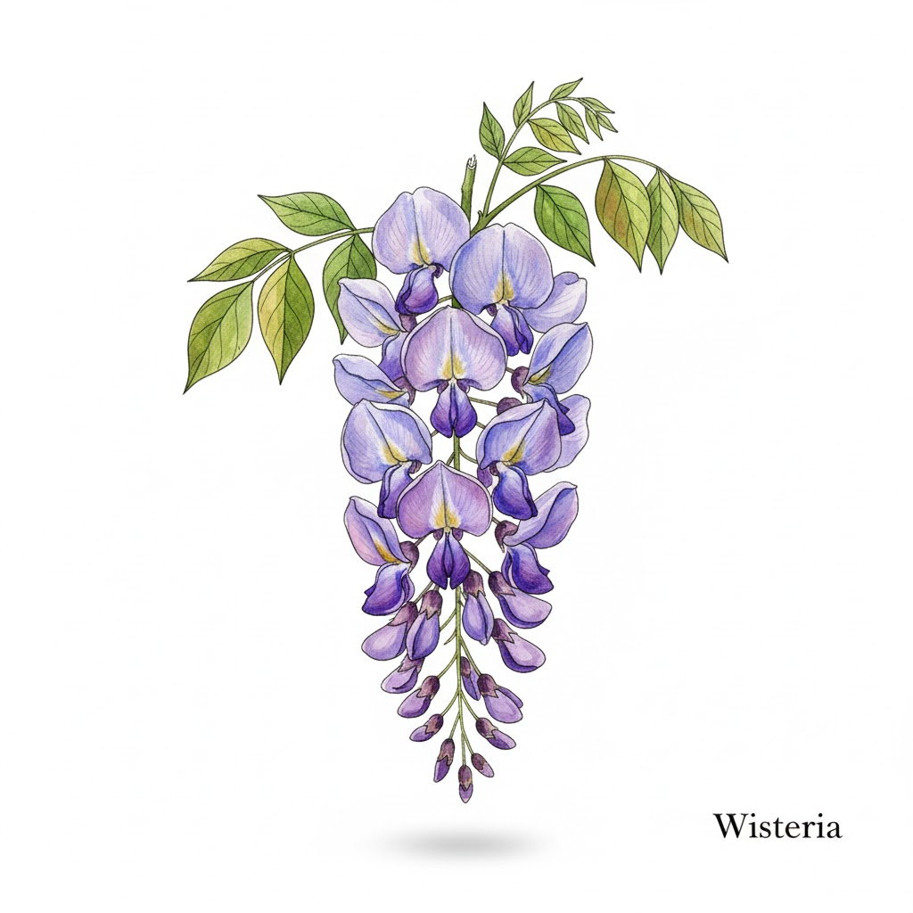 High-Fidelity Botanical Illustration of a Wisteria flower. Classic scientific watercolor style, hyper-realistic detail and color. Isolated on a clean white background. Museum-quality digital painting, 16K. Include the text "Wisteria" in an elegant serif font in the bottom right corner.