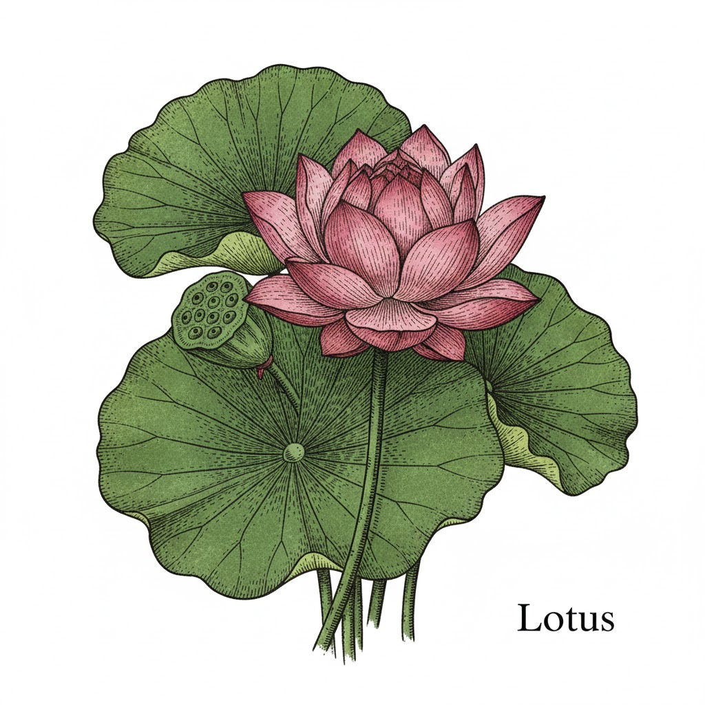 High-Fidelity Botanical Illustration of a Lotus flower. Vintage lithograph style, rich color, detailed lines. Isolated on a clean white background. Museum-quality digital painting, 16K. Include the text "Lotus" in an elegant serif font in the bottom right corner.