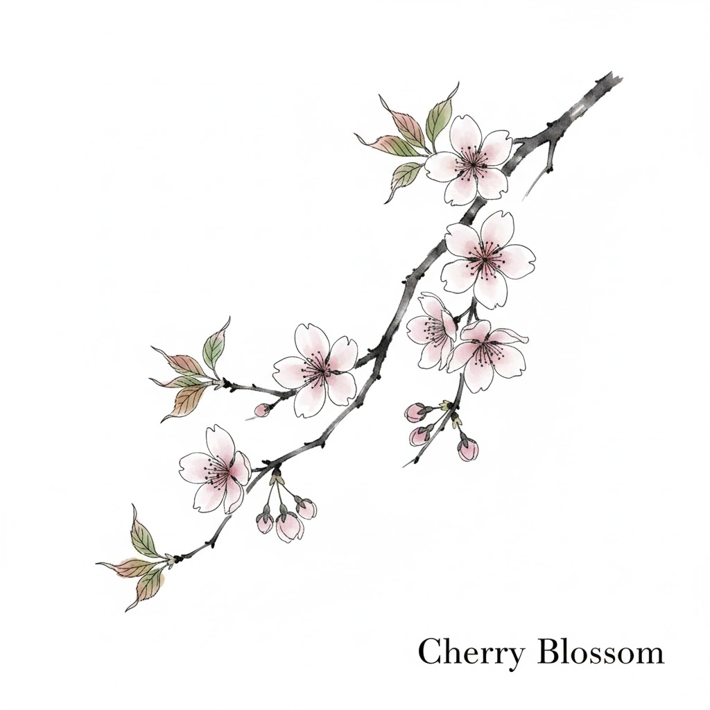 High-Fidelity Botanical Illustration of a Cherry Blossom flower. Contemporary ink wash style, delicate black ink and subtle color accents, minimalist. Isolated on a clean white background. Museum-quality digital painting, 16K. Include the text "Cherry Blossom" in an elegant serif font in the bottom right corner.