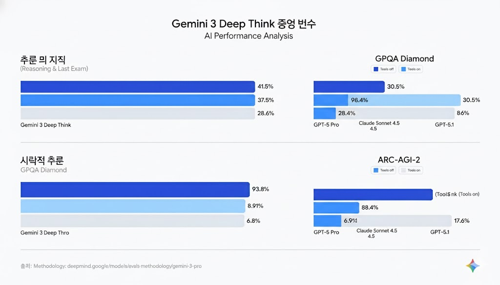 💡 Insight: 여기서 주목할 점은 **41%**라는 수치입니다. 경쟁 모델인 GPT-5 Pro(30.7%)와 비교했을 때 무려 10% 포인트 이상의 격차를 벌렸습니다. 이는 단순한 성능 개선이 아니라, 문제 해결을 위한 사고의 깊이(Deep Think)가 완전히 다른 차원에 도달했음을 시사합니다.