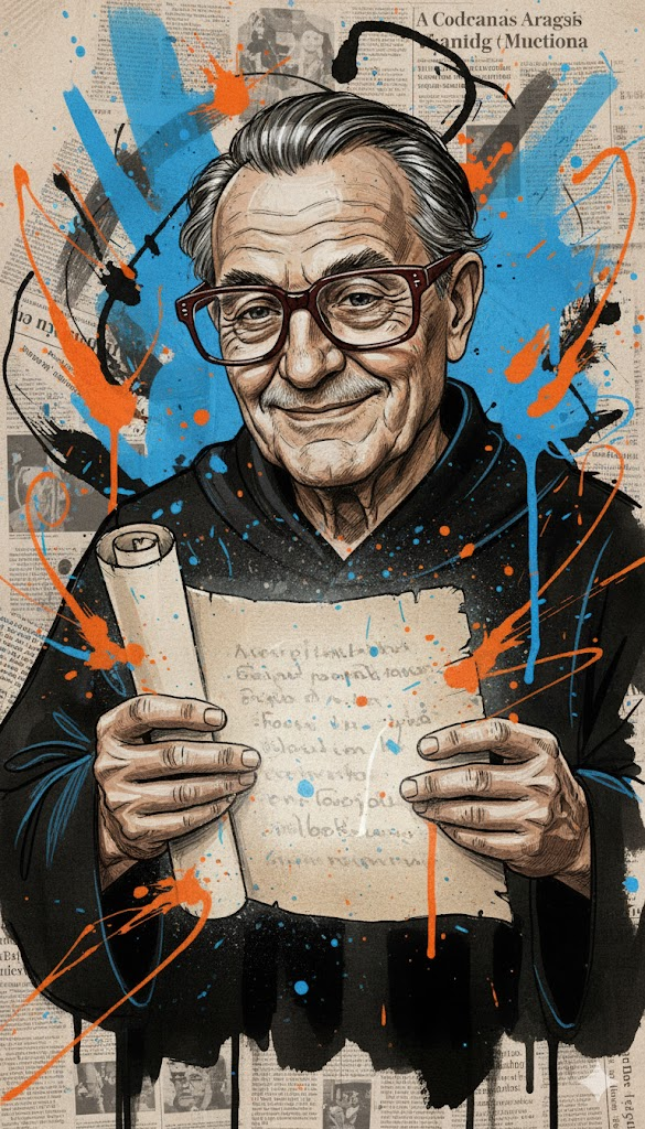 Generate an image from the uploaded photo of an elderly scholar reading an ancient scroll, wearing oversized heavy mahogany-framed glasses. Render the face in dynamic black strokes on a textured newspaper background, with splashes of vivid blue and orange paint. Blend realism and abstract expressionism to evoke innocence, hope, and creativity.