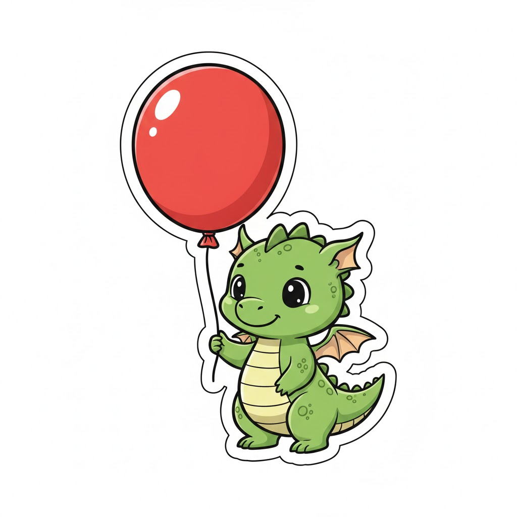 3. 풍선 든 아기 용: "A cute [baby dragon] [holding a balloon]. Cartoon style vector illustration, perfect for a die-cut sticker. Isolated on a white background."