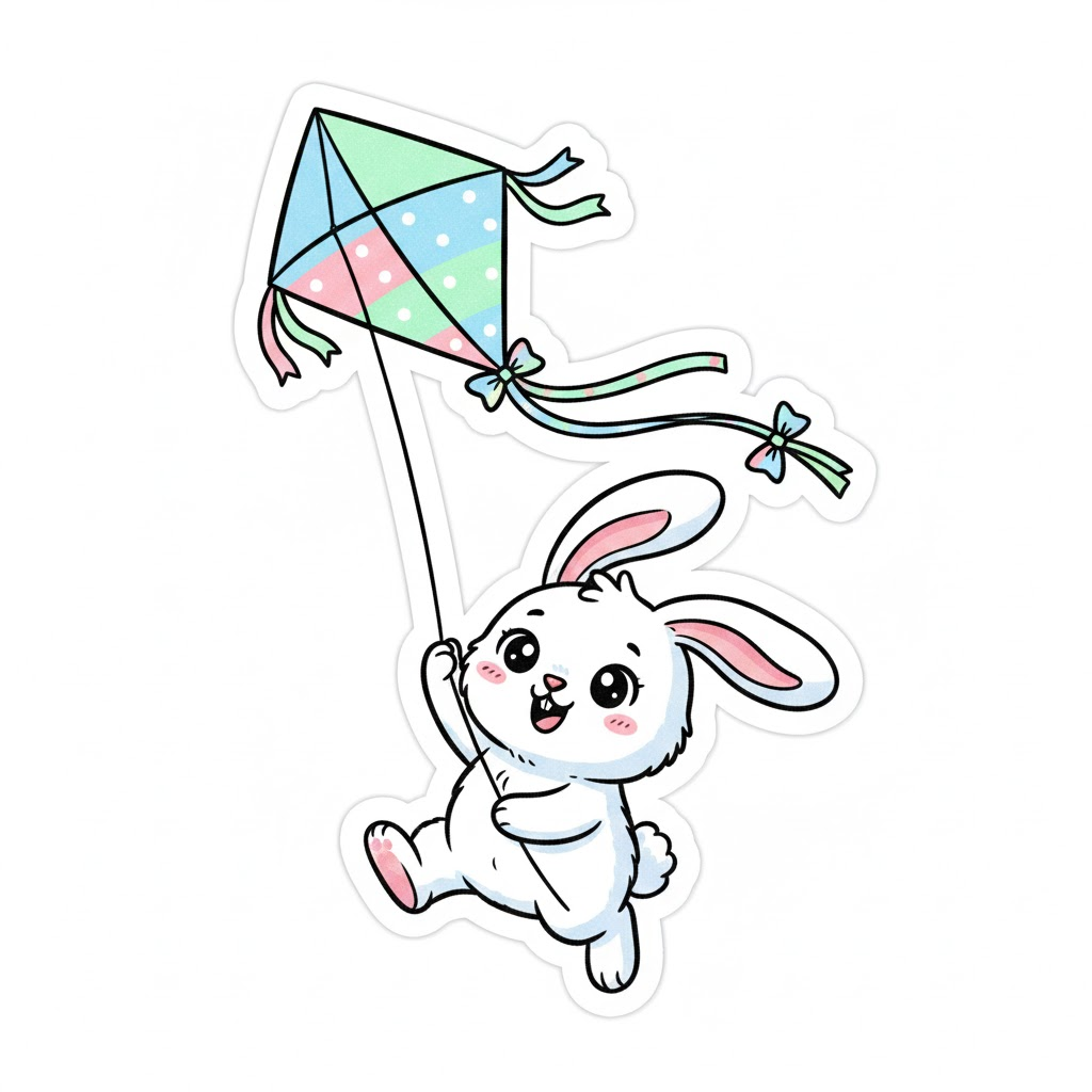 2. 연 날리는 토끼: "A cute [fluffy bunny] [flying a kite]. Cartoon style vector illustration, perfect for a die-cut sticker. Isolated on a white background."