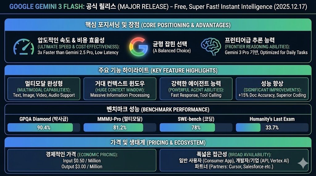 이번 출시의 핵심 슬로건은 "Free, Super Fast! Instant Intelligence"입니다. Gemini 3 시리즈의 경량화 선구자로서, 단순한 속도 개선을 넘어선 압도적인 퍼포먼스를 자랑합니다.