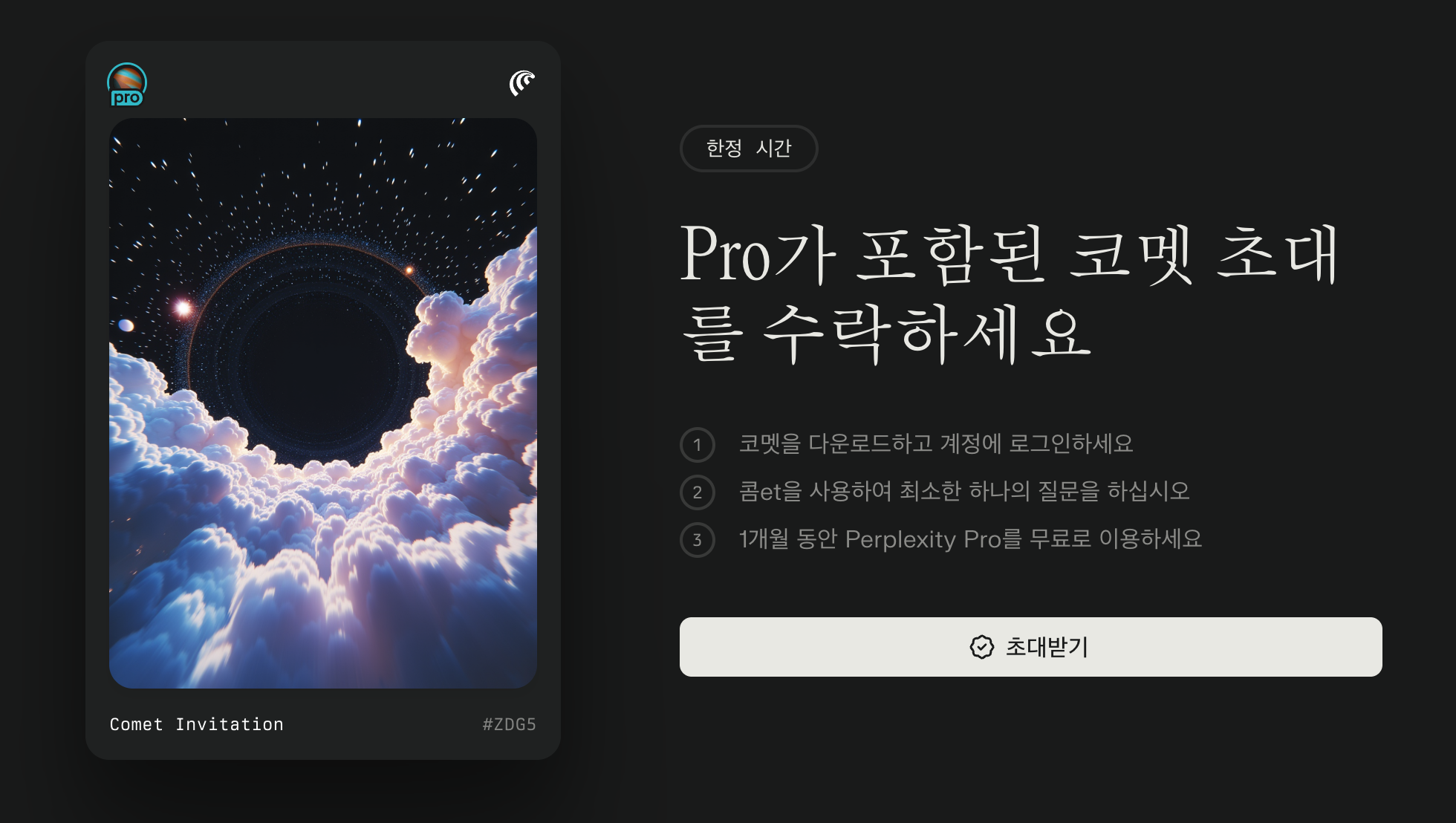 이 이미지는 Perplexity의 "Pro가 포함된 코멧 초대 받기" 이벤트 안내 화면입니다. 주요 내용은 다음과 같습니다.