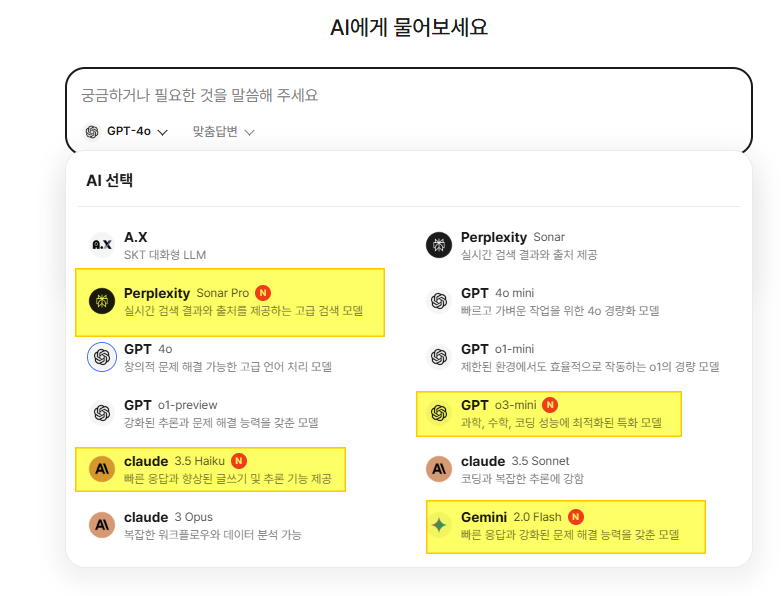 - 사용자는 A.X, GPT, 클로드, 퍼플렉시티, 제미나이 등 다양한 AI 모델을 선택해 활용 가능