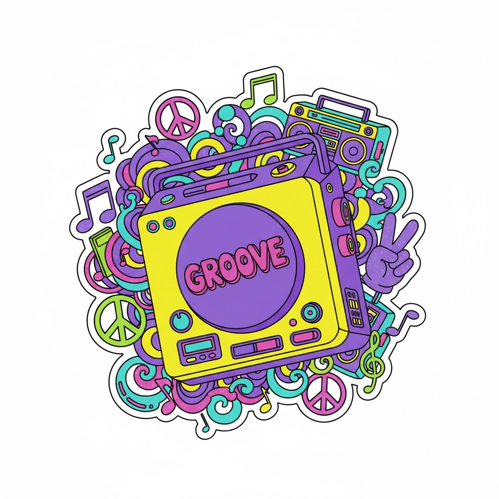 A retro Y2K style sticker featuring a [yellow and purple portable CD player] with 'GROOVE' on it, surrounded by [swirling music notes, boomboxes, and peace signs]