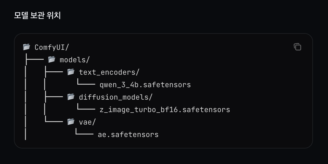 Z-Image-Turbo 를 사용하려면, 아래 파일들을 다운로드하고 지정 폴더 구조에 저장해야 합니다.